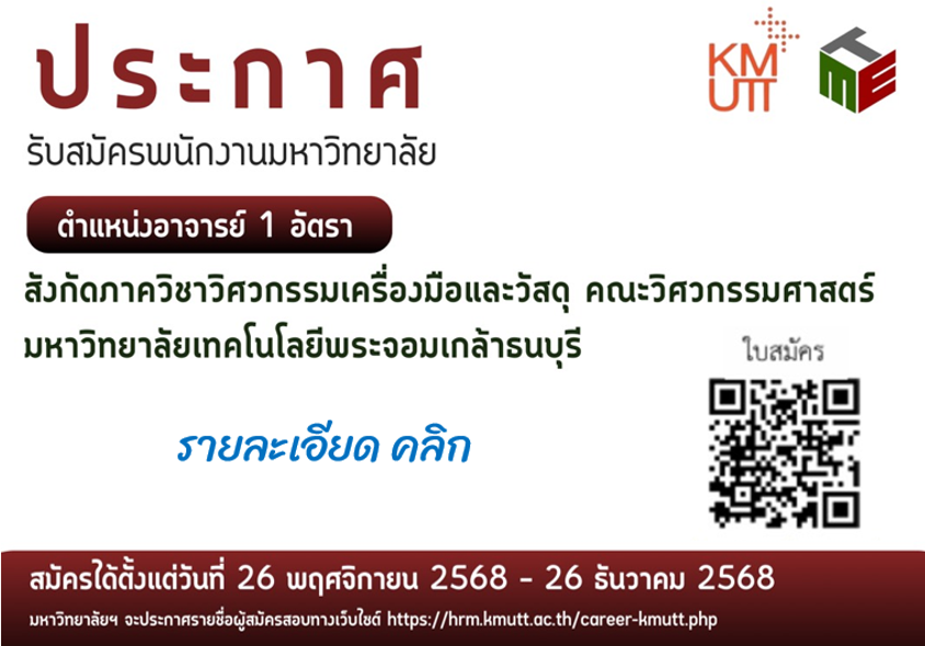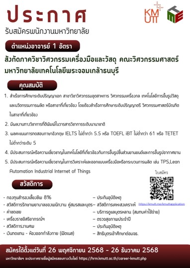 ประกาศรายชื่อผู้สมัครทางเว๊บไซต์ >>> https://hrm.kmutt.ac.th/career-kmutt.php